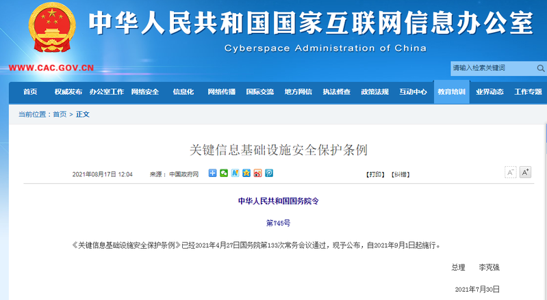 中華人民共和國國務院令第745號《關鍵信息基礎設施安全保護條例》已經2021年4月27日國務院第133次常務會議通過,現予公布,自2021年9月1日起施行。總理  李克強2021年7月30日關鍵信息基礎設施安全保護條例第一章 總  則第一條 為了保障關鍵信息基礎設施安全,維護網絡安全,根據《中華人民共和國網絡安全法》,制定本條例。第二條 本條例所稱關鍵信息基礎設施,是指公共通信和信息服務、能源、交...